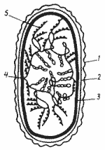 Под капсулой понимают слизистое образование, обволакивающее клетку, сохраняющее связь с клеточной стенкой и имеющее аморфное строение (см. рис. 3, 19 ; 4, 2 ). Если толщина образования меньше 0,2 мкм и, следовательно, оно может быть обнаружено только с помощью электронного микроскопа, говорят о микрокапсуле. Если больше 0,2 мкм, говорят о макрокапсуле. Последнюю можно видеть в обычный световой микроскоп. Для этого препарат просматривают в капле туши, которая не в состоянии проникнуть в капсулу. На темном фоне выделяются клетки, окруженные светлыми зонами. Если же слизистое вещество имеет аморфный, бесструктурный вид и легко отделяется от поверхности прокариотной клетки, говорят о слизистых слоях, окружающих клетку (см. рис. 4, 3 ).