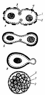 Вариантом бинарного деления является почкование, которое можно рассматривать как неравновеликое бинарное деление. При почковании на одном из полюсов материнской клетки образуется маленький вырост (почка), увеличивающийся в процессе роста. Постепенно почка достигает размеров материнской клетки, после чего отделяется от последней. Клеточная стенка почки полностью синтезируется заново (рис. 20, В). В процессе почкования симметрия наблюдается в отношении только продольной оси. При равновеликом бинарном делении материнская клетка, делясь, дает начало двум дочерним клеткам и сама, таким образом, исчезает. При почковании материнская клетка дает начало дочерней клетке, и между ними можно в большинстве случаев обнаружить морфологические и физиологические различия: есть старая материнская клетка и новая дочерняя. В этом случае можно наблюдать процесс старения. Так, для некоторых штаммов Rhodomicrobium показано, что материнская клетка способна отпочковывать не более 4 дочерних клеток. Дочерние клетки лучше приспосабливаются к меняющимся условиям. Почкование обнаружено в разных группах прокариот: среди фото- и хемотрофов, осуществляющих авто- и гетеротрофный конструктивный метаболизм. Вероятно, оно в процессе эволюции возникало несколько раз.