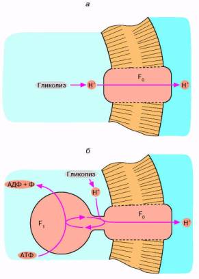 ионов 1-Г, образуемых гликолизом: а - облегченная диффузия ионов Н* посредством белка (фактора F0 ), образующего FT-проводящий путь сквозь клеточную мембрану; 6 - комплекс факторов F0 и F, (Н*-АТФаза) активно откачивает из клетки ионы FT за счет гидролиза АТФ. Мембранные липиды показаны горизонтальной штриховкой, белки не заштрихованы