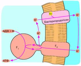 лелюбивых архебактерий. Ионы Н* откачиваются из клетки бактериородопсином - белком, содержащим ретиналь в качестве хромофора, то есть группировки, поглощающей видимый свет. Ионы Н* возвращаются в клетку, двигаясь "под гору" через Н*-АТФазный комплекс F0 F,. При этом оказывается, что 1-Г-АТФаза катализирует обратную реакцию, то есть синтез АТФ, а не его гидролиз