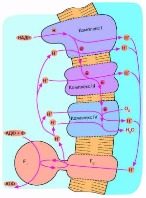 Комплекс I не восстанавливает никотинамид-ный нуклеотид, а окисляет его. Комплекс IV не окисляет воду до О2 , а восстанавливает О, до воды. В итоге мы имеем сложную цепь реакций, начинающихся с окисления НАДН и кончающихся восстановлением О,. Все три комплекса дыхательной цепи способны откачивать из клетки ионы Н+ сопряженно с переносом электронов (рис, 7).