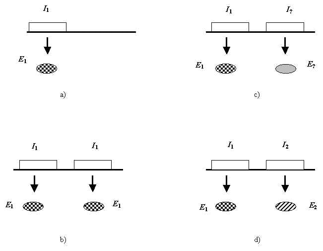 Рис. 1. Иллюстрация к механизму прогрессивной эволюции в теории нейтральности. Схема появления нового биологически значимого белка. Показаны участки ДНК ( Ii ) и кодируемые ими белки ( Ei ). a) ген I 1 кодирует белок E 1 , b) дупликация гена I 1 , новый участок (справа) кодирует тот же белок E 1 , c) случайный дрейф правого участка, d) возникновение нового биологически значимого белка E 2 кодируемого участком ДНК I 2 .