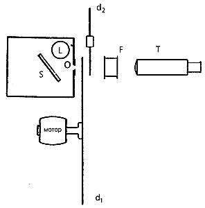 Схема установки Ю.Б.Харитона. L - газонаполненная лампа; O - небольшое отверстие в ящике; S - медная пластинка, напыленная оксидом магния; d1, d2 - диски с отверстиями, вращающиеся с разной скоростью; F - фильтр, наполненный водным раствором CuSO4 и K2 Cr2 O7 . Подбором состава добивались минимального поглощения при l = 500 нм. Полоса пропускания фильтра (l = 470-520 нм) соответствовала цвету сцинтилляций: чувствительность глаза в этой полосе близка к максимальной. T - зрительная труба.