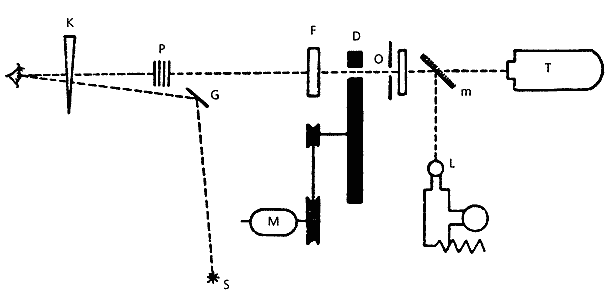 Схема второго варианта установки С.И.Вавилова. S - красная лампочка; G - стеклянная пластинка; L - лампочка, питаемая от аккумулятора; m - зеркало; O - диафрагма, закрытая молочным стеклом; F - зеленый фильтр; P - стопа стеклянных пластинок; K - нейтральный оптический клин; D - диск, насаженный на ось синхронного мотора (M); T - эталонный источник света (абсолютно черное тело).