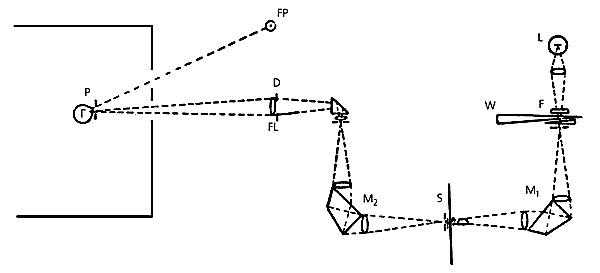 Схема установки С.Хехта. Г - глаз наблюдателя; P - диафрагма; FP - красная точка; FL - линза; D - диафрагма; L - лампа, питаемая от аккумулятора; F - нейтральный фильтр; W - оптический клин; М1М2 - двойной монохроматор; S - затвор. При нажиме кнопки затвор открывает путь световому потоку (l = 510 нм) на 1 мс.