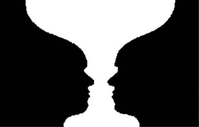рис. 1. Обращение фигуры и фона, придуманное в 1915 г. Эдгаром Рубиным. В зависимости от перцептивного гештальта, зритель видит либо вазу, либо два лица в профиль.