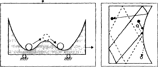 В 60-е годы было установлено, что и в простых динамических системах, которые считались со времен Ньютона и Лапласа подчиняющимися определенным и однозначным законам механики, возможны случайные явления, от которых нельзя избавиться путем уточнения начальных условий и исчерпывающим описанием воздействий на систему. Такие движения возникают в простых динамических системах с небольшим числом степеней свободы - нелинейных колебательных системах как механических, так и электрических. Пример такого неустойчивого движения - шарик в двух ямах, разделенных барьером (рис 177). При неподвижной подставке шарик имеет два положения равновесия.