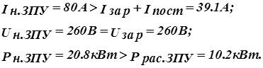 По полученным в процессе расчета напряжению, току и мощности принимаем зарядно-подзарядный агрегат типа ВАЗН-380/260-40/80. Технические данные которого удовлетворяют условиям выбора: