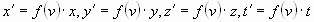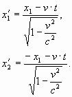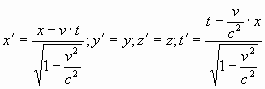 - координаты одного и того же события (показания приборов) покоящейся и движущейся систем отсчета, соответственно. Воспользовавшись, также как и Лоренц, его требованиями, принято искать преобразования в виде: