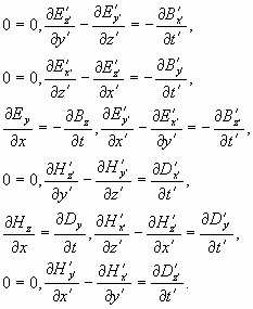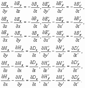 . Они считаются искомыми. Согласно Максвеллу, записываются шесть уравнений для компонент свободного электромагнитного поля в покоящейся и движущейся системах отсчета: