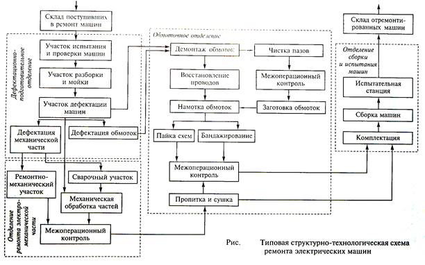 Все работы, проводимые в этом цехе, можно разбить на восемь основных видов: предремонтные, разборочно-дефектационные, изоляционно-обмоточные, слесарно-механические, комплектовочные, сборочные, отделочные и послеремонтные. В соответствии с видом производимых работ в состав ремонтного цеха, как правило, входят следующие отделения и участки:
