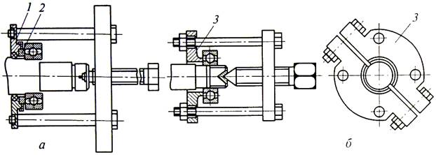 Рис. 3.4. Снятие подшипников с использованием вставок (а) и хомута (б): 1 — внутренняя крышка подшипника; 2 — прокладки; 3 — хомут