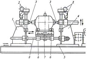 пользуют специальный стенд для разборки двигателей (рис. 3.6). Перед установкой на стенд с двигателя снимают кожух вентилятора, вентилятор и болты, крепящие крышки подшипников, и подшипниковые щиты. Двигатель устанавливают на стенде рабочим концом вала к подвижной стойке 1 и закрепляют с помощью зажимов 6. С помощью электропривода 2 устанавливают пиноли-3 по высоте оси вращения двигателя и, перемещая стойку 1 вправо, фиксируют двигатель в пинолях (правая стойка 4 неподвижна). Включают движение стола 7 влево по направляющим 8, при котором левый подшипниковый щит выпрессовывается с наруж ного кольца подшипника, а правый — из замка на корпусе. Между правым подшипником и корпусом двигателя устанавливают опорную вилку (не показана) и включают движение стола вправо. При этом левый подшипниковый щит выпрессовывается из замка на корпусе, а правый подшипник — с вала. Устанавливают опорную вилку между левым подшипником и корпусом двигателя и включают движение стола 7 влево, производя выпрессовку левого подшипника с вала. Затем выводят пиноли 3 из центров вала, поворачивают стол 5 с двигателем на угол 60...90° и снимают с вала крышки подшипников, подшипниковые щиты и подшипники.