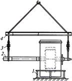 Чтобы не повредить обмотки статора при выводе ротора, их закрывают листами из прессшпана или резины. Ротор извлекают с помощью грузоподъемных механизмов и специальных скоб (для роторов массой до 500 кг), пригодных для роторов машин до 19 габарита включительно. Для выведения ротора на кран подвешивают траверсу 4 (рис. 3.7) с двумя регулировочными болтами 3. На вал надевают удлинитель 2. Вывесив ротор с помощью крана и регулировочных болтов 3, выводят его из статора (вправо) и опускают на предварительно установленную рядом со статором подставку (не показана). Затем снимают удлинитель, переносят левый строп на левый конец вала, вывешивают ротор и перемещают его на место ремонта или для дальнейшего транспортирования. Статор остается на своей фундаментной плите 1.