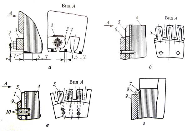 Для машин большей мощности, имеющих относительно высокие зубцы, указанные способы ремонта не применяют, поскольку они не обеспечивают прочное и надежное скрепление зубцов и создают замкнутые контуры для протекания вихревых токов. В этом случае рекомендуется установить дополнительную шайбу 6с пальцами (зубцами) 5, как показано на рис. 4.1, б, или установить отдельные нажимные пальцы 5 между сердечником и нажимной шайбой Я как показано на рис. 4.1, в. Фиксация дополнительных элементов может производиться с помощью штифтов 10. Такой ремонт возможен при распрессовке сердечника и его частичной или полной перешихтовке.