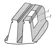 При выгорании или оплавлении участка зубца 2 сердечника удаляют дефектную часть и устанавливают на ее место «протез» 1 из стеклотекстолита для предотвращения выпучивания обмотки (рис. 4.2). Удаление поврежденной области производят с помощью острого зубила с его возможным предварительным высверливанием, после чего устраняют замыкания листов. «Протез» изготавливается по месту и устанавливается на клее ЭЛ-4.