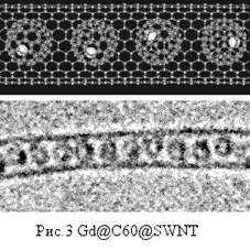 Пустоты внутри нанотрубок (и углеродных каркасных структур вообще) также привлекали внимание ученых. В самом деле, а что будет, если внутрь фуллерена поместить атом какого-нибудь вещества? Эксперименты показали, что интеркаляция (т.е. внедрение) атомов различных металлов меняет электрические свойства фуллеренов и может даже превратить изолятор в сверхпроводник! А можно ли таким же образом изменить свойства нанотрубок? Оказывается, да. В работе [3] ученые смогли поместить внутрь нанотрубки целую цепочку из фуллеренов с уже внедренными в них атомами гадолиния! На Рис.3 схематично показана структура такой нанотрубки и приведен снимок, полученный исследователями с помощью электронной микроскопии. Электрические свойства такой необычной структуры сильно отличались как от свойств простой, полой нанотрубки, так и от свойств нанотрубки с пустыми фуллеренами внутри. Как, оказывается, много значит валентный электрон, отдаваемый атомом металла во всеобщее распоряжение! Кстати, интересно отметить, что для таких соединений разработаны специальные химические обозначения. Описанная выше структура записывается как Gd@C60@SWNT, что означает "Gd внутри C60 внутри однослойной нанотрубки (Single Wall NanoTube)".