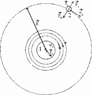 Рис.1. Двумерная модель гравитационного взаимодействия двух тел. Указаны силы, действующие на тело 2. Fc-центробежная сила, Fп-сила притяжения тела 2 со стороны тела 1, v2– линейная скорость тела 2 по орбите, R – радиус орбиты, r1 – радиус тела 1, r2 – радиус тела 2, w1 – угловая скорость вращения эфира на поверхности тела 1.