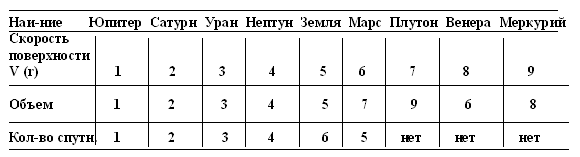 В таблице представлен приоритет (место) каждой планеты в собственных параметрах -скорости своего вращения, в своем физическом объеме и в количестве спутников.