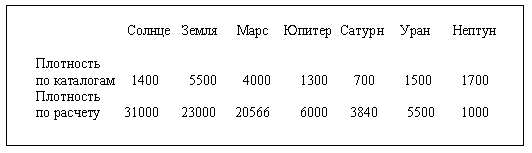 В результате расчетов были определены плотности и, соответственно массы планет. Полученные значения могут вызвать большие сомнения при их объективном анализе. Трудно согласиться, что звезда Солнце, в которой происходит термоядерная реакция, вызванная большой массой и большим уплотнением вещества в этой звезде, имеет плотность всего лишь 1400 кг/куб. м. Гигант Сатурн и того легче – 700 кг/куб.м., что равносильно плотности сухой древесины или тяжелого газа. Вычисление гравитационной постоянной в условиях земной гравитации в многочисленных попытках ученых всего мира имеют погрешность в пределах 1/1000.
