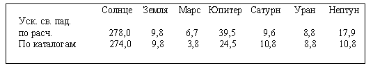 В табл. 2 приведены расчетные значения ускорения свободного падения на планетах, согласно вихревой гравитации, и для сравнения указаны классические данные.