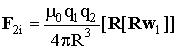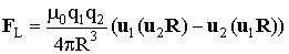 где R - расстояние между зарядами. На каждый из зарядов со стороны магнитного поля, создаваемого другим зарядом будет действовать сила Лоренца FL1, FL2, так что суммарная сила Лоренца в системе FL = FL1 + FL2. Отсюда после подстановок и алгебраических преобразование получим: