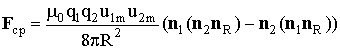 где n1, n2 - единичные векторы вдоль принятых за положительные направлений скоростей зарядов, nR- единичный вектор вдоль направления радиус-вектора расстояния между зарядами.