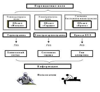 Роль алгоритмов самоорганизации в ИТ обработки сигналов. Рассмотрим три объекты разной физической природы - расплав железоуглеродистого металла, сердце человека и биологическую жидкость (кровь, слюна и т.п.). Несмотря на различие физической природы этих объектов, для них правомерна общая рабочая гипотеза (1): объекты порождают сигналы, несущие ценную информацию об их состоянии (рис. 5).