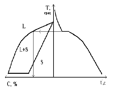 Обратимся к рис. 6, в левой части которого в координатах температура T (температура) – C (содержание углерода) показан фрагмент известной диаграммы состояния Fe-C сплава. На диаграмме имеется две линии - ликвидуса и солидуса. Выше линии ликвидуса металл находится в жидком состоянии (область L), ниже линии солидуса - в твердом состоянии (область S), а между этими линиями - в переходном состоянии (область L+S).