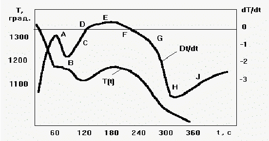 Природа пошла навстречу в разрешении этой проблемы. Дело в том, что в момент начала кристаллизации происходит экзотермическая реакция - выделения скрытой теплоты кристаллизации. Поэтому, если зарегистрировать процесс охлаждения расплава (см. правую часть рис. 6), то на графике процесса