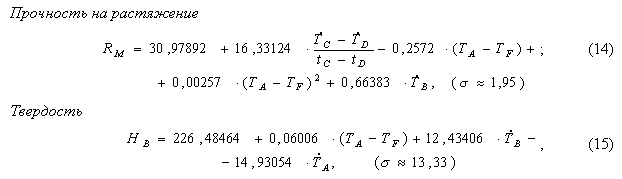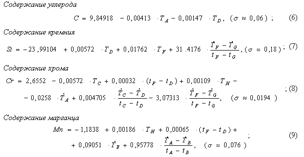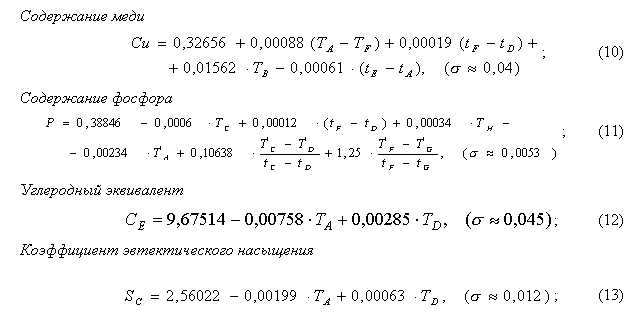 Структурная и параметрическая идентификация таких моделей проводилось на основе использования двух выборок термограмм (обучающей и контрольной) с известными значениями технологических параметров. Построенные таким образом модели для условий Купянского литейного завода имели вид: