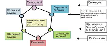 Рис. 1. Условное отображение взаимного соотношения основных свойств элементарных звуков речи, произносимых в каждой артикуляционной зоне.