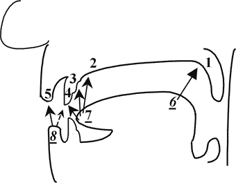 1. Заднее нёбо(1)-задняя часть(корень) языка(6);