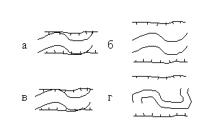 б – “неразвитое” меандрирование в широкой долине, на широкой пойме (ничем не ограничено).