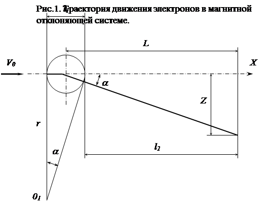 Магнитная отклоняющая система обычно содержит две пары катушек, надеваемых на горловину трубки и образующих магнитные поля во взаимно перпендикулярных направлениях. Рассмотрим отклонение электрона магнитным полем одной пары катушек, считая, что поле ограничено диаметром катушки и в этом пространстве однородно. На рис.1 силовые линии магнитного поля изображены уходящими от зрителя перпендикулярно плоскости чертежа. Электрон с начальной скоростью V0 движется в магнитном поле, вектор индукции B которого нормален к вектору скорости V0 , по окружности с радиусом