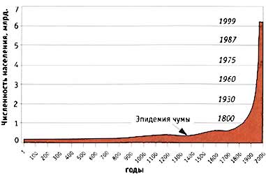 В начале нашей эры на Земле обитало 200-300 миллионов человек, и тысячу лет спустя эта численность существенно не менялась. В середине второго тысячелетия население планеты стало быстро расти: во времена Колумба (~1500 г.) на Земле жило ~500 млн. человек, при Галилее (~1600 г.) их стало ~550 млн., при Ньютоне (~1700 г.) их было уже ~650 млн., а в начале XIX века Уатт и Фарадей были современниками ~1 млрд. человек. В последнее столетие число обитателей нашей планеты удваивалось каждые 40- 50 лет: при Планке, в начале XX века — 1.6 млрд., к концу XX века — 6 млрд. Нетрудно сосчитать, что при таком темпе размножения людей уже через две тысячи лет их масса превысит массу Земли.