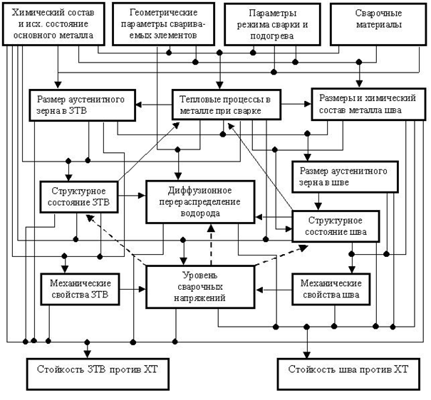 Рис. 2. Схема взаимосвязей показателей свариваемости НЛС с процессами, протекающими в металле при сварке