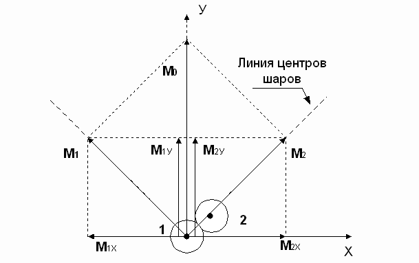 Массы шаров для простоты все равны. Если, как было показано выше, результирующий импульс после столкновения сложится из двух проекций на ось