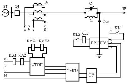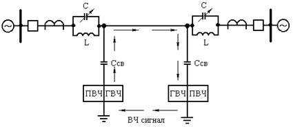 ВЧ обработке подвергаеться одна фаза линии и ВЧ сигнал замыкаеться по контуру фазфземля. В комплект ВЧ апаратуры входит: генератор ВЧ (ГВЧ), приемник ВЧ (ПВЧ), загородительный фильтр который представляет собой колебательны контур, он настраиваеться врезонанс с частотой ВЧ сигнала по этому ВЧ сигнал не может сквозь этот фильтр пройти. С - конденсатор связи устанавливаеться для того, чтобы отделить ГВЧ и ПВЧ от высокого напряжения и не пропустить ток промышленной частоты в ВЧ аппаратуру.