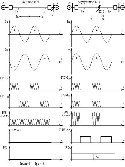 Привнутреннем коротком замыкании ток по концам линии совпадает по фазе поэтому в ВЧ канале идет прерывный сигнал а значит на выходе ПВЧ пояляеться импульсный ток который сглаживаеться и подаеться в реогирующий орган а следовательно защита срабатывает.