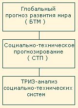 Основная задача СОЦИАЛЬНО-ТЕХНИЧЕСКОГО ПРОГНОЗИРОВАНИЯ — создание системы взаимосвязанных прогнозов подсистем БТМ: прогноз развития энергетики, систем водоснабжения, городов, сельского хозяйства, культуры, образования, спорта, транспорта... ТРИЗ-АНАЛИЗ направлен на выявление основных противоречий конкретной социально-технической системы (завода, комбината, коммерческой структуры...), и решение выявленных задач. При выборе и постановке этих задач используются социально-технические прогнозы. |