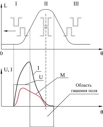 Для перехода к генераторному режиму ВИМ необходимо сместить время подачи импульса напряжения в момент согласованного положения или при подходе к нему (I и II рис.6). С этой целью при подходе к согласованному положению (II рис.6) (ротор генератора вращается под действием внешнего момента) замыкают ключи S1 и S2, подключая фазу А к источнику питания. Импульс напряжения, поданный на катушки фазы, создаст магнитный поток, являющийся потоком возбуждения генератора. Механический момент при этом практически равен нулю. По достижению определенного угла или определенного уровня тока ключи S1 и S2 размыкаются. В обмотке фазы создается ЭДС, под действием которой открываются диоды D1 и D2. При дальнейшем перемещении зубцов ротора относительно зубцов статора индуктивность фазы уменьшается, что приводит к увеличению ЭДС, старающейся поддержать потокосцепление фазы постоянным. Через нагрузку (рис.2) и катушки фазы под действием ЭДС генератора потечет ток, создающий тормозной момент на валу генератора (рис.6). Как и в двигательном режиме, непрерывное преобразование энергии достигается путем коммутации фаз в соответствии с показаниями датчика положения ротора.