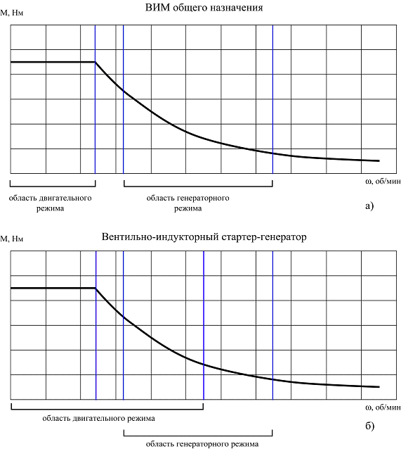 Диапазон скоростей вращения ВИСГ, как в стартерном, так и в генераторном режиме, должен быть широким и полностью покрывать диапазон рабочих скоростей вращения ДВС. Особенность ВИСГ заключается в том, что существует диапазон скоростей вращения, при которых ВИМ должна работать и как стартер, и как генератор, что исключается при проектировании ВИМ на один из режимов (рис.7а). Таким образом, диапазоны рабочих скоростей стартера и генератора должны взаимно перекрываться (рис.7б).