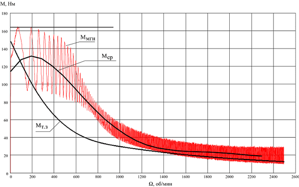 На рис.9 представлена механическая характеристика, полученная при математическом моделировании стартерного режима ВИСГ (Мср), а также требуемая механическая характеристика (Мт.з). Как видно из зависимости мгновенного значения момента (Ммгн рис. 10), ВИСГ обладает значительными пульсациями момента, что является недостатком всех ВИМ с одинарной симметричной коммутацией. Вследствие большого момента инерции ДВС, данный фактор не оказывает отрицательного влияния на работу стартера.