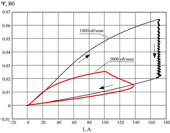 На средних скоростях вращения ЭДС генератора вызывает нарастание тока фазы после прекращения возбуждения (точке окончания возбуждения соответствует точка с током 100А рис.12). На рис. 12 представлена энергетическая диаграмма для скорости вращения 5000 об/мин и, для сравнения, для скорости 1000 об/мин. Возбуждение при этом производится до значений тока, значительно меньшего, чем при низких скоростях. Стрелками показано направление изменения потокосцепления в течение цикла коммутации фазы. Энергетическая диаграмма позволяет также определить среднее значение момента, который пропорционален площади, охватываемой годографом ,I.