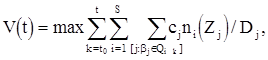 Физически критерий (1) означает, что число выполненных работ с учетом их весовых коэффициентов за любой интервал времени должно быть максимальным. Согласно ограничению (2) у-я работа не может начаться раньше окончания своих условий. Для начала любой работы необходимо, чтобы к данному моменту времени были выполнены технологические условия а также свободны ресурсы, обеспечивающие ее выполнение. Ресурсы могут переходить с других работ, которые также для данной работы являются условиями