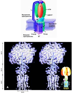 АТФаза состоит из двух отдельных частей: (1) F0 , гидрофобной части, связанной с мембраной, ответственной за транспорт протонов, и (2) F1 , гидрофильной части, ответственной за синтез и гидролиз АТФ (см. рис.1).