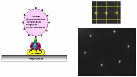 При добавлении к набору получившихся наномоторов 2 мM Na2ATФ и при присутствии в растворе 4 мM MgCl2 дифференциальным интерферометром наблюдалось вращение микросферы, составляющее 9.5-10.5 Гц, или 3-4 об/сек. Причем вращение представляло собой дискретные изменения угла, образованного γ-субъединицей и α3 β3 - комплексом, каждый раз на 120°.