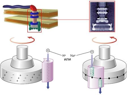 Как и протонные АТФсинтазы, электромоторы бактерий являются устройствами, которые в качестве источника энергии используют разность протонных потенциалов на цитоплазматической мембране. Принципы работы АТФсинтазы и бактериального мотора одинаковы, хотя сами эти конструкции различаются по своим размерам и устройству (см. рис. 9, 10). Можно с уверенностью сказать, что бактериальный мотор - аналог машины постоянного тока, созданной человеком.