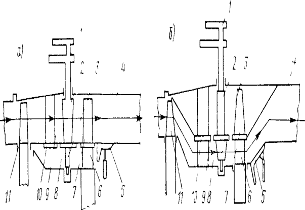 7—рабочие лопатки ПХ; 8 —газовый канал ЗХ; 9 —газовый канал ПХ; 10 —разделитель газового потока; 11 — рабочие лопатки предыдущей турбины.